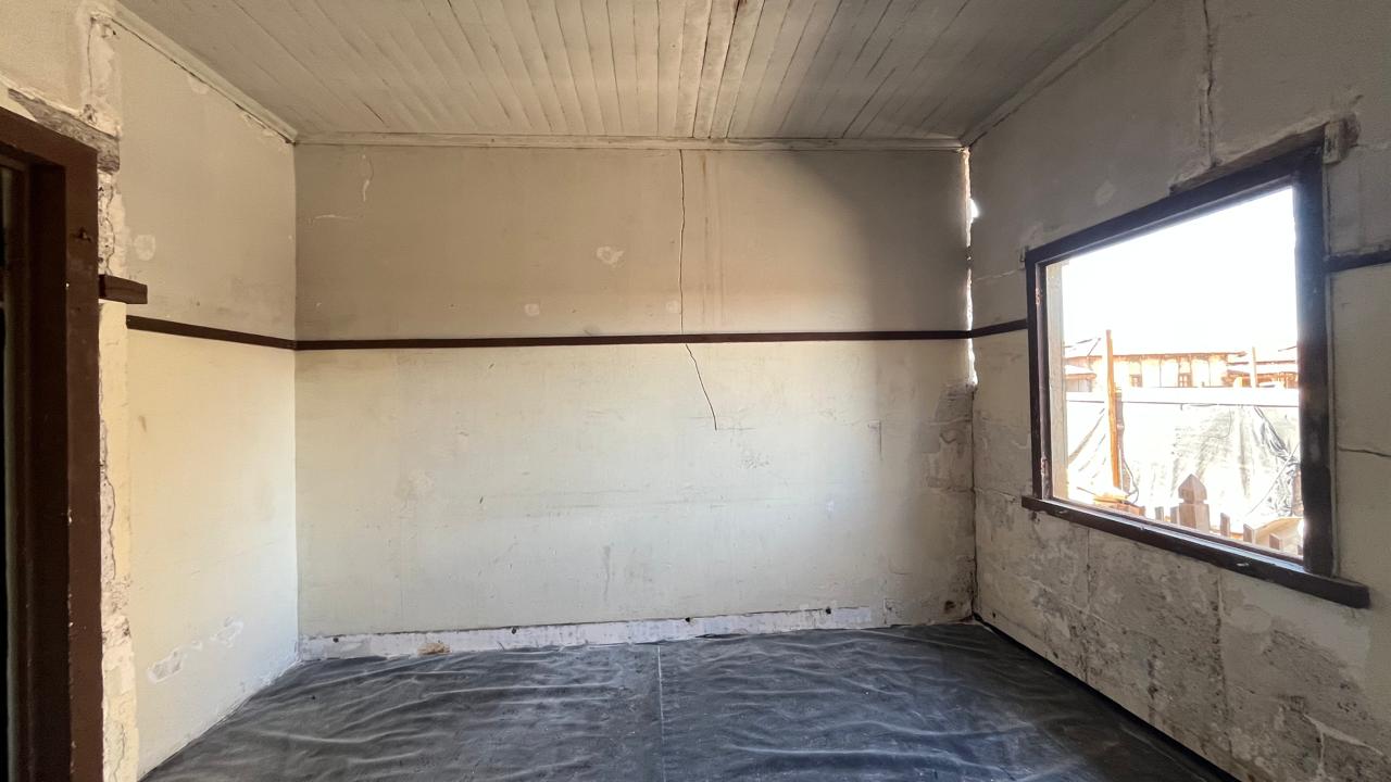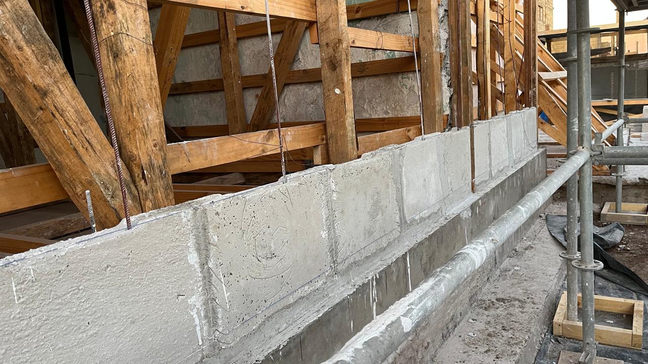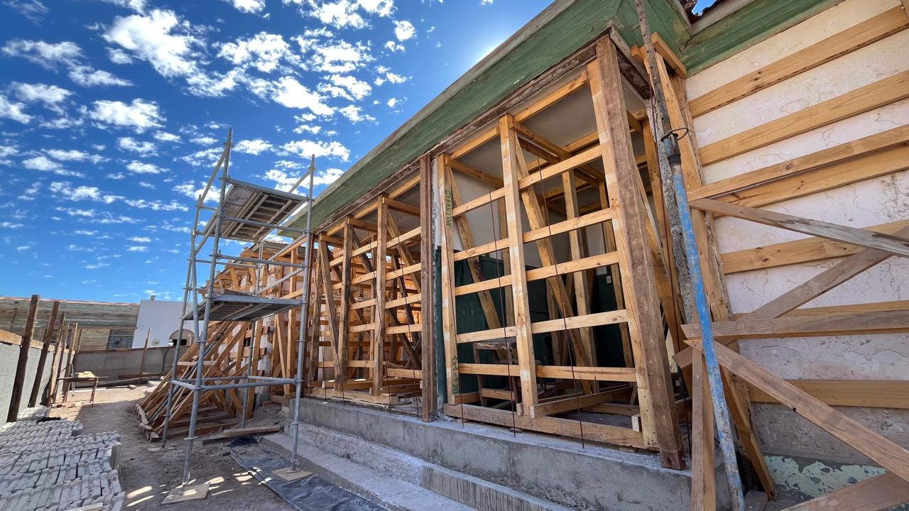 Reparación de cimientos, grietas, puertas y ventanas; reposición de bloques de yeso y consolidación de muros interiores; restauración completa de las cubiertas y del sistema de aguas lluvias, así como de los revestimientos. |